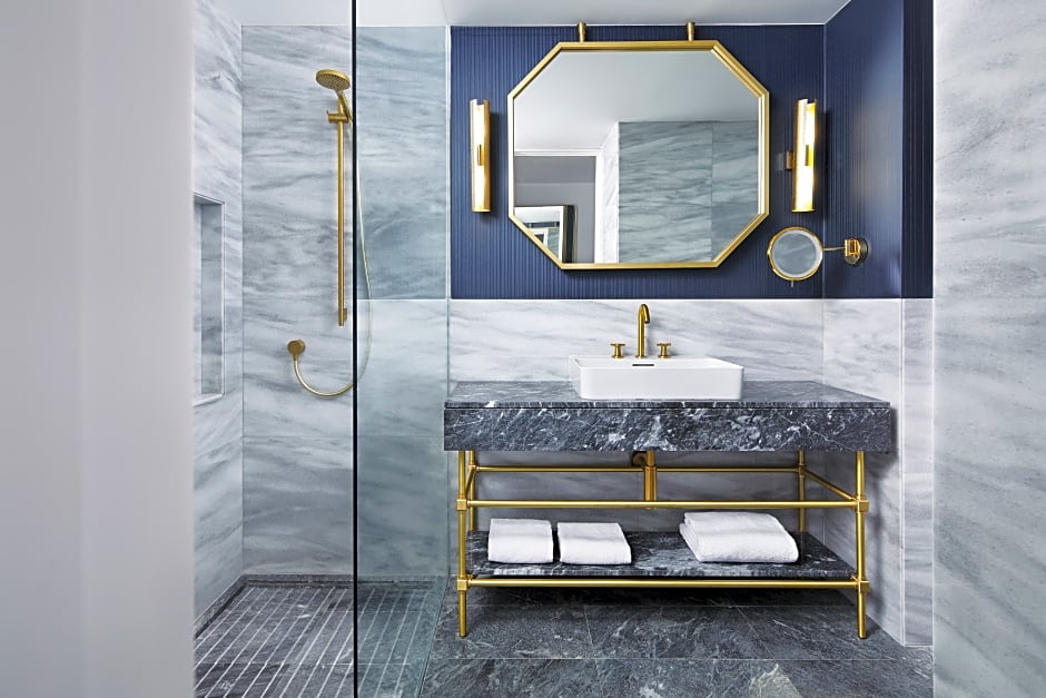 This is a spacious suite featuring separate living room, guest half-bathroom, dining area and luxurious bedroom with bathtub, shower and bidet.